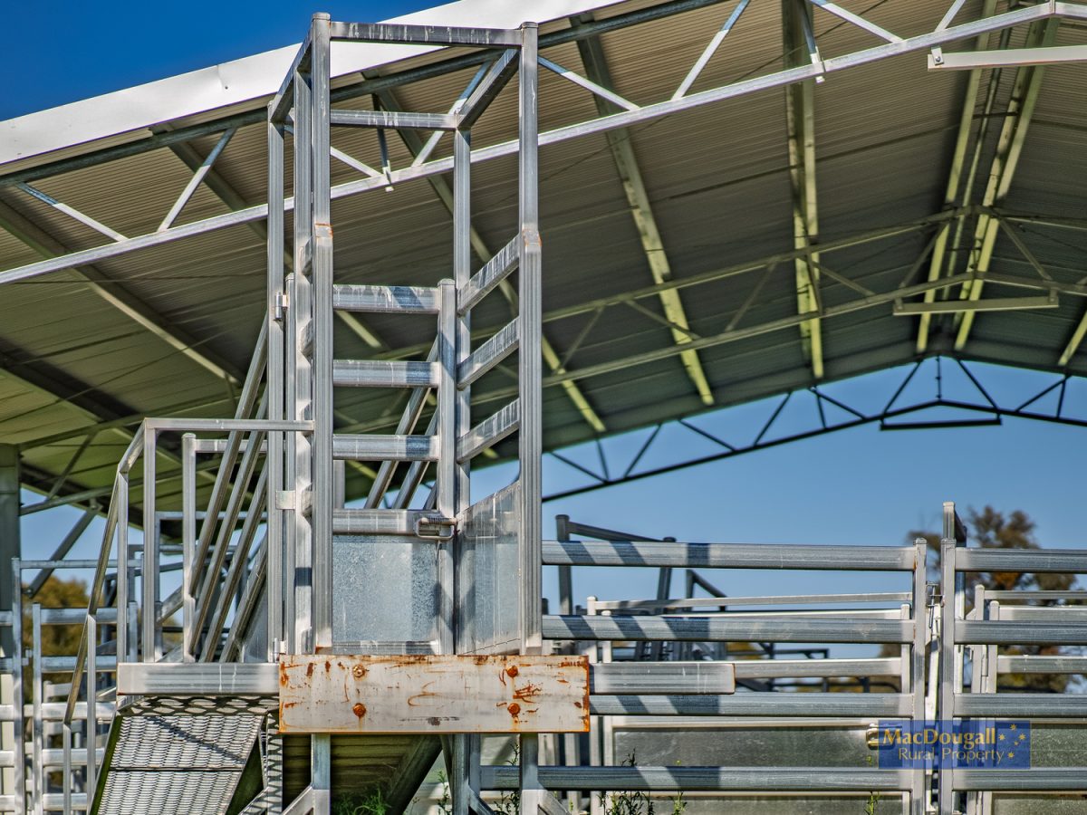 The covered steel cattle yards incorporate a curved V-race, Immobilizer crush, easy drafting system and cat-walks along the working race and the loading race enhancing user safety. The yards have concrete flooring in the veterinary area, shale base elsewhere and a steel roof to keep the sun and rain at bay.