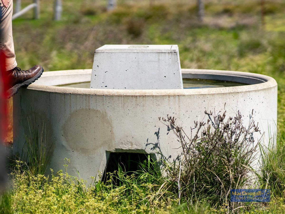 A bore equipped with a solar powered 3 inch Grundfos submersible pump was installed in 2021. Measured as 120 litres/minute, this sends water to the nearby 104,000 litre Rhino header tank. This tank is fitted with a Farmbot water monitoring system that can be accessed remotely via the internet. Water is then gravity fed to 13 modern concrete troughs via 50mm PVC piping.